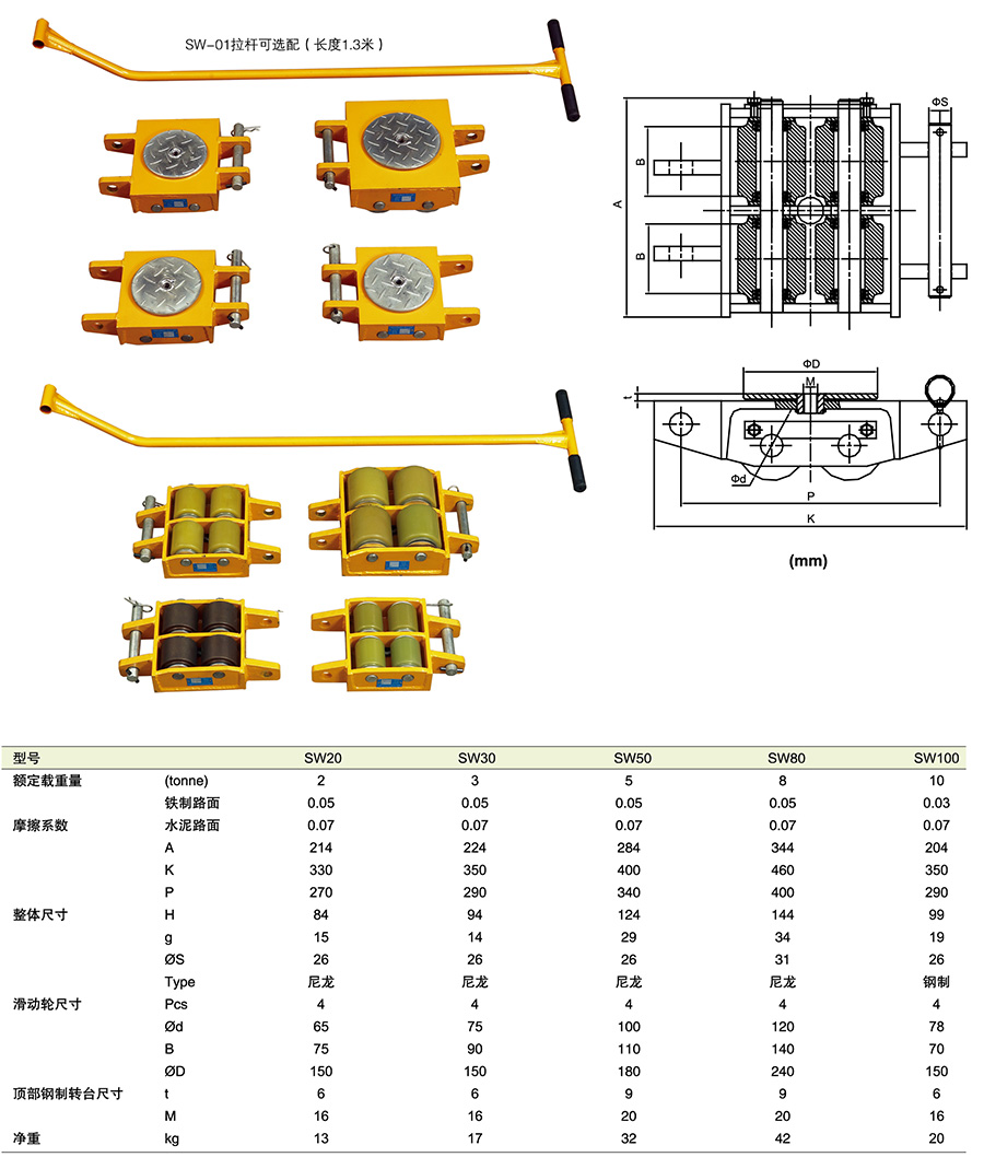 ● 與撬棒或千斤頂配合使用,可用于重型貨物的搬運。大直徑尼龍輪(10噸型號配備鋼輪)幫助搬運省力,保護地面以防受損。